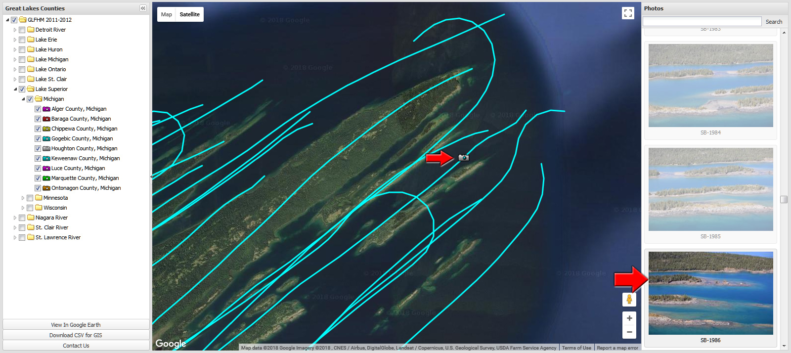 Each colored track represents the path taken by the airplane that captured imagery of the shoreline.