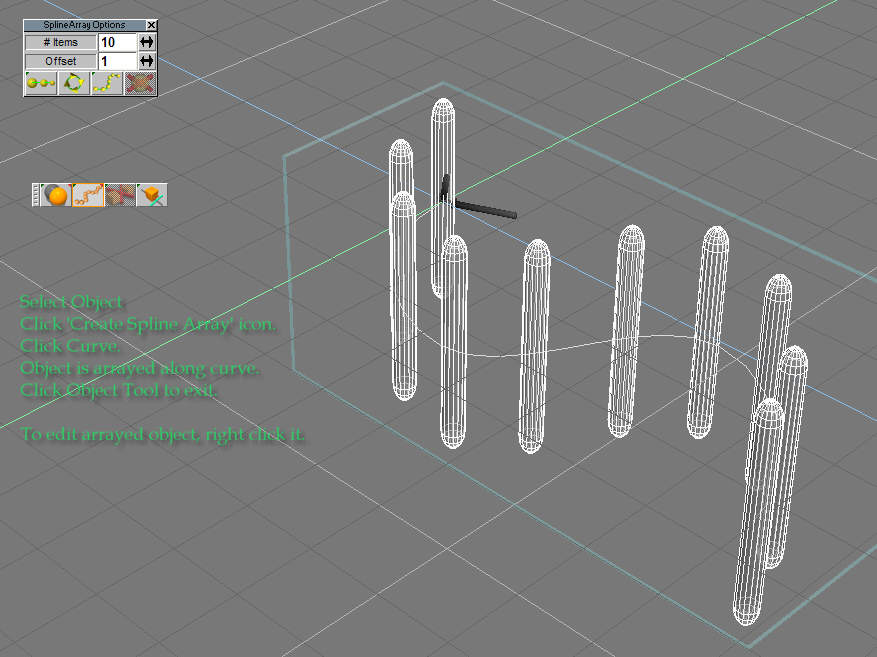 Next, select the loaded curve by clicking on it. The object is immediately arrayed along the curve. Click Object Tool to exit creation mode. To further edit as shown earlier, right click the new